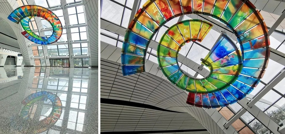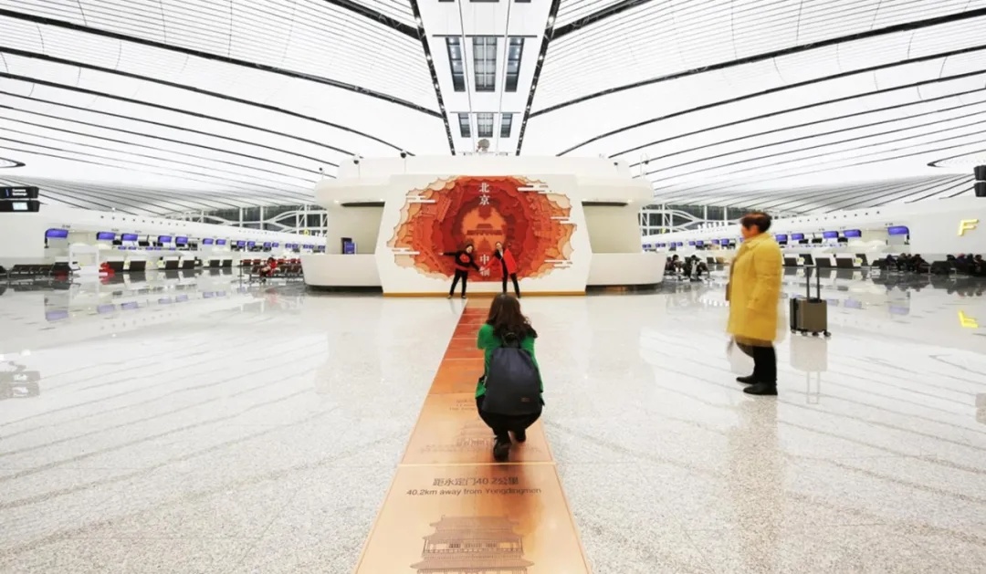 以机场的大堂、5个指廊、户外庭院为载体,通过国内外艺术家及公共艺术的有效介入,壁画、雕塑、交互艺术、装置艺术等多种艺术形式,通过与功能和人流活动的有机结合,将单调的交通空间塑造成为充满艺术价值和人文关怀的可体验场所,展现新历史时期首都新机场作为新国门的历史担当和发展潜力。